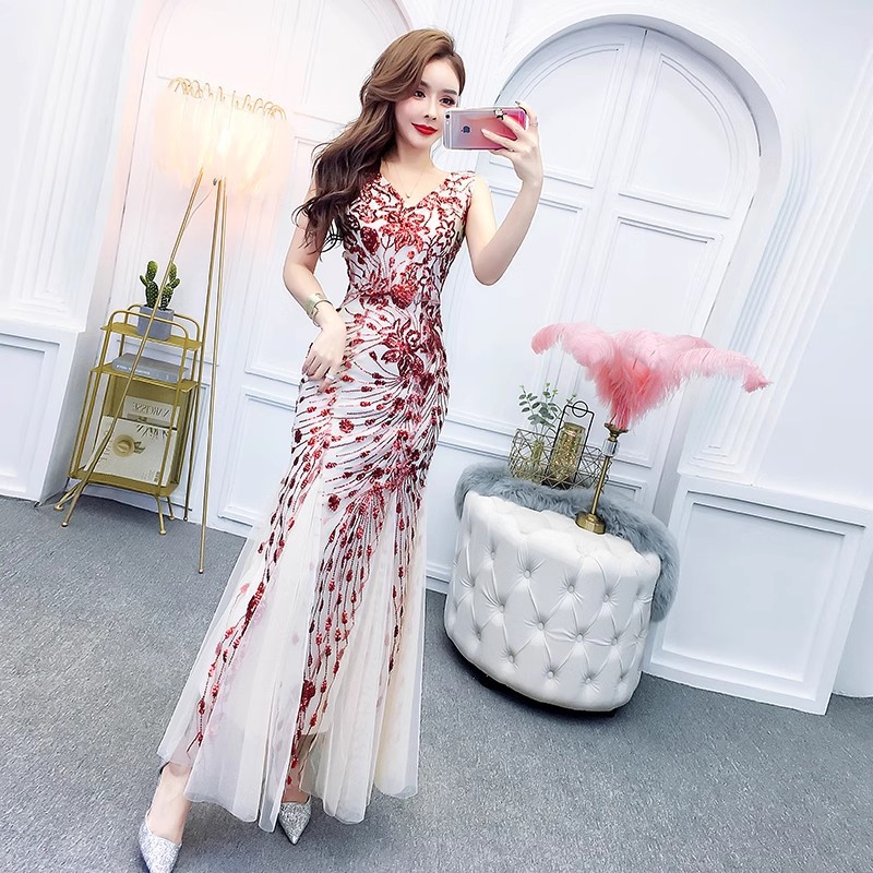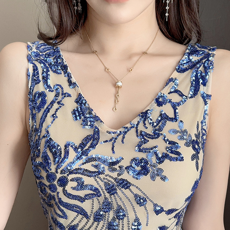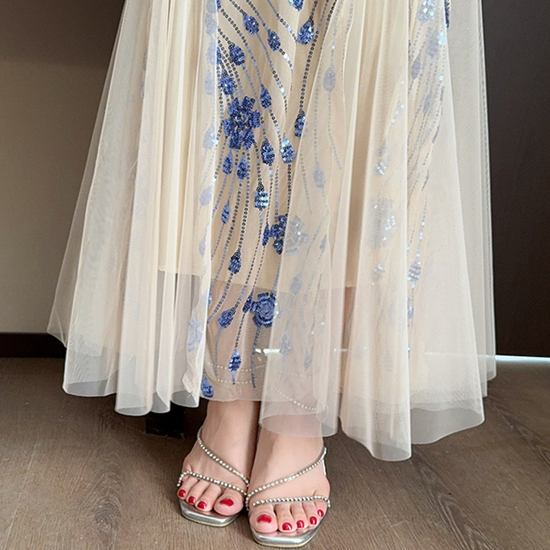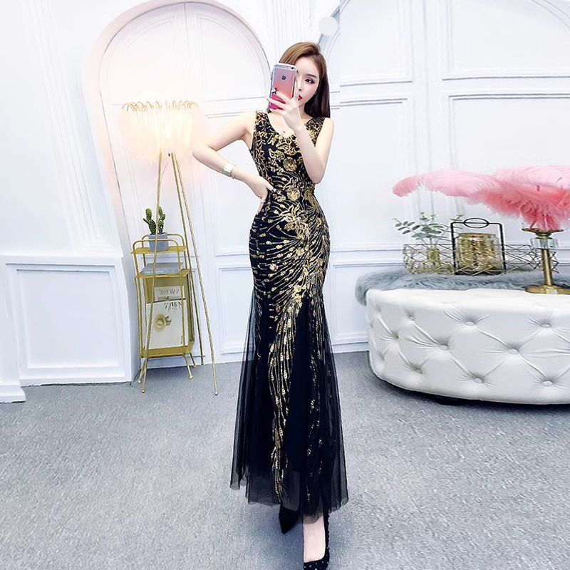 エレガントなスパンコール装飾メッシュデザイン ロングドレス キャバドレス