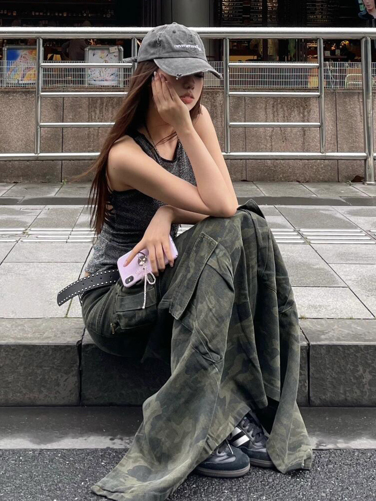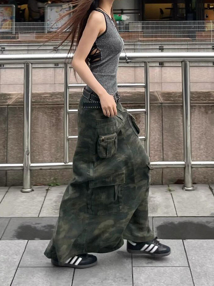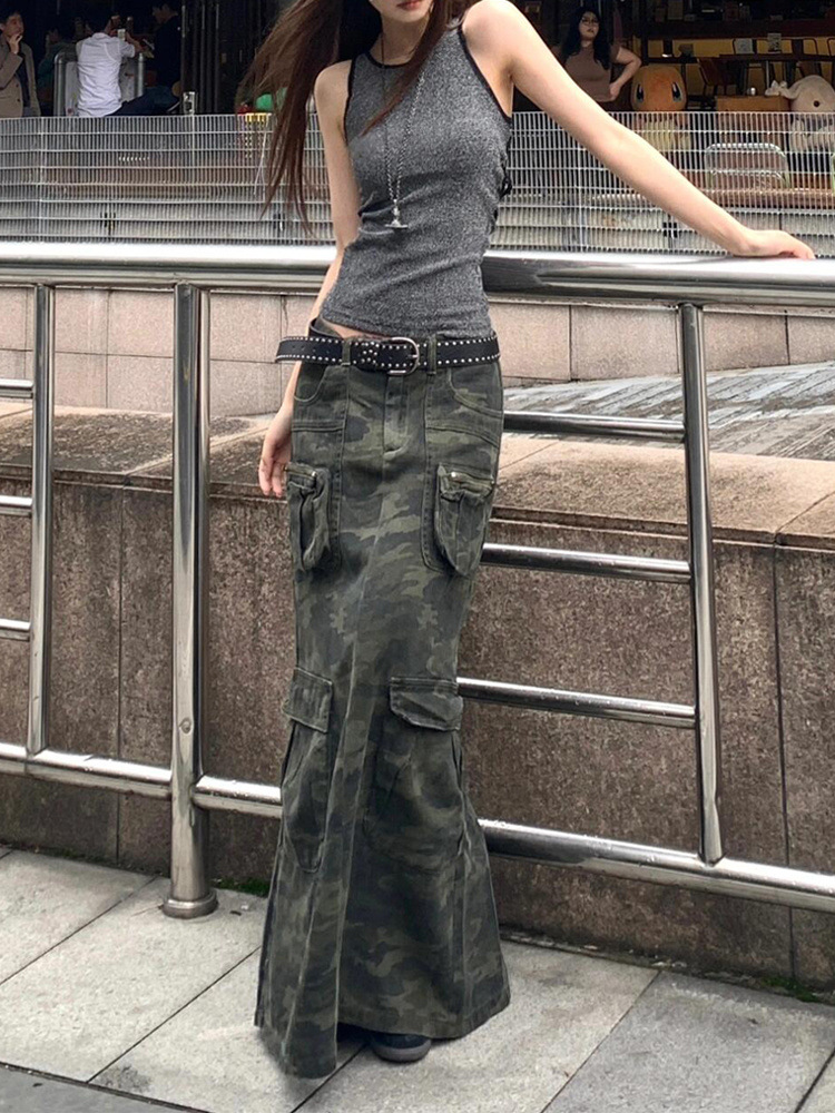 目立ち度MAX!オシャレなデニム生地デザイン 大きなサイズ 迷彩柄ロングスカート【MARVELOUS QUEEN】(納期2週間前後)