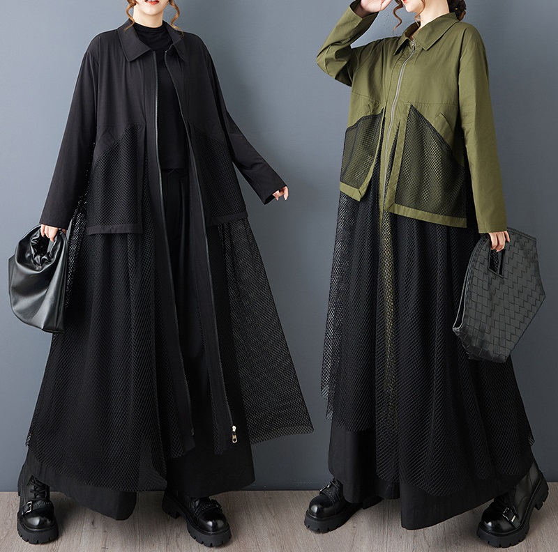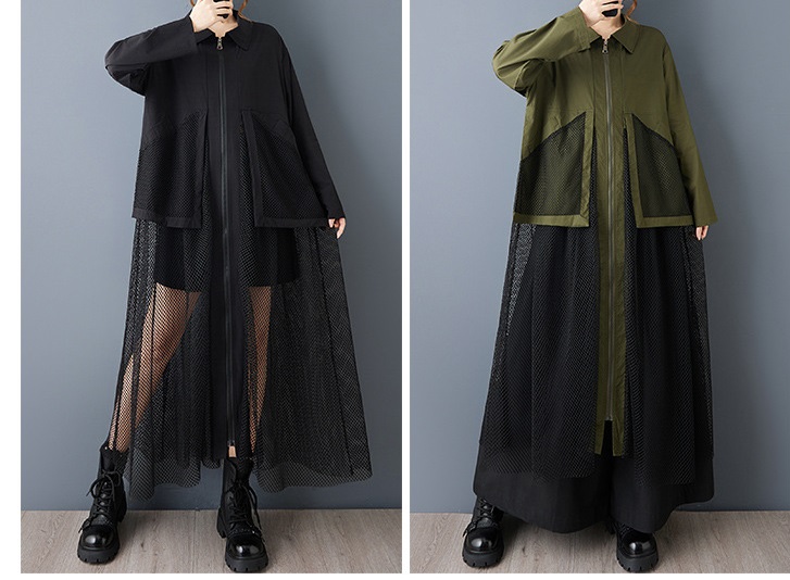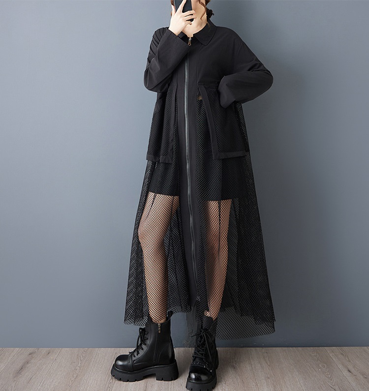 個性派スタイル オシャレな脚部メッシュレースデザイン チュニックシャツ長袖ワンピース【MARVELOUS QUEEN】
